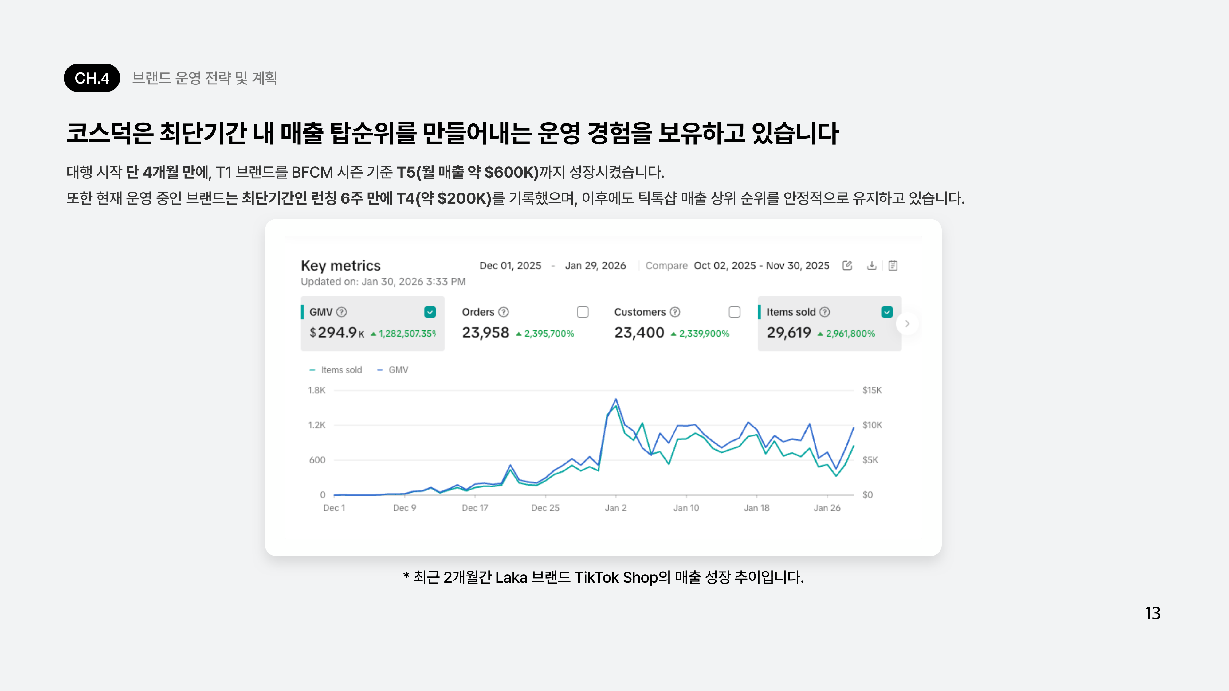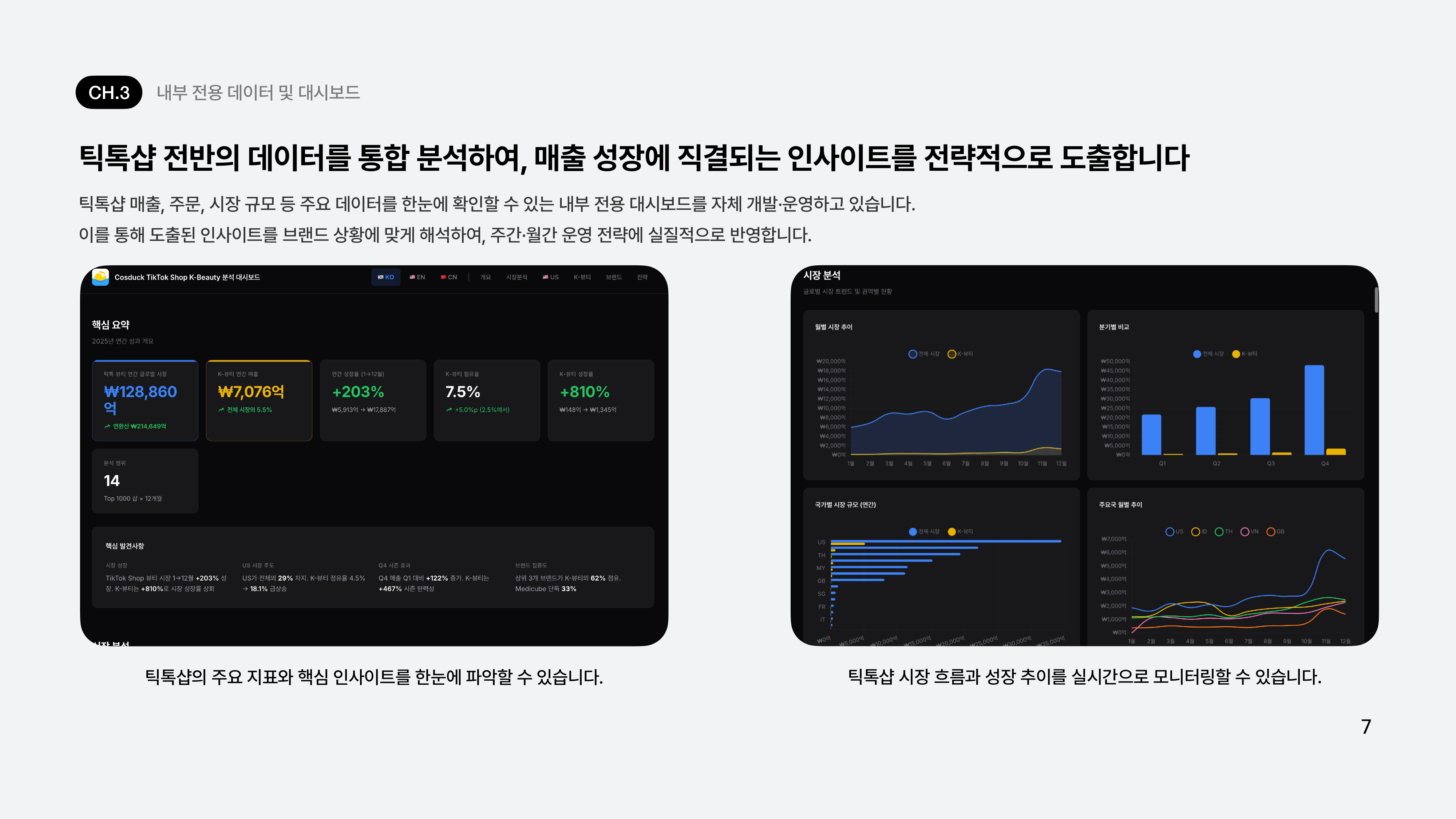 틱톡샵 매출, 주문, 시장 규모 등 주요 데이터를 한눈에 확인할 수 있는 내부 전용 대시보드를 자체 개발·운영하고 있습니다.