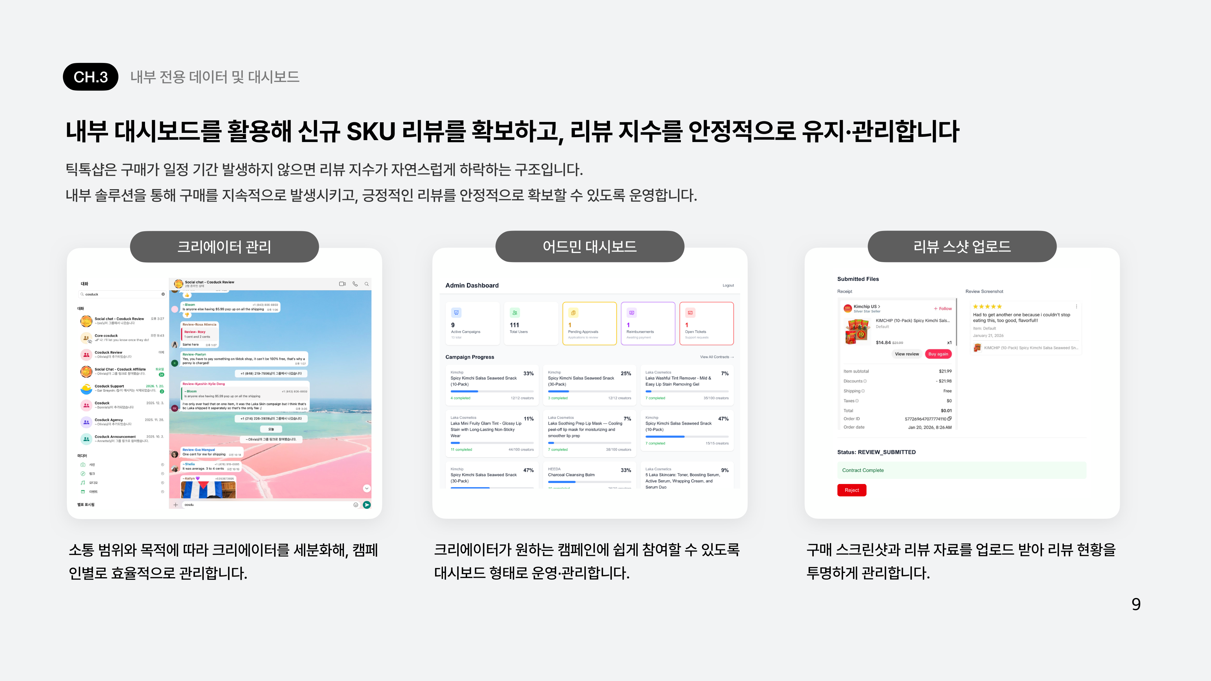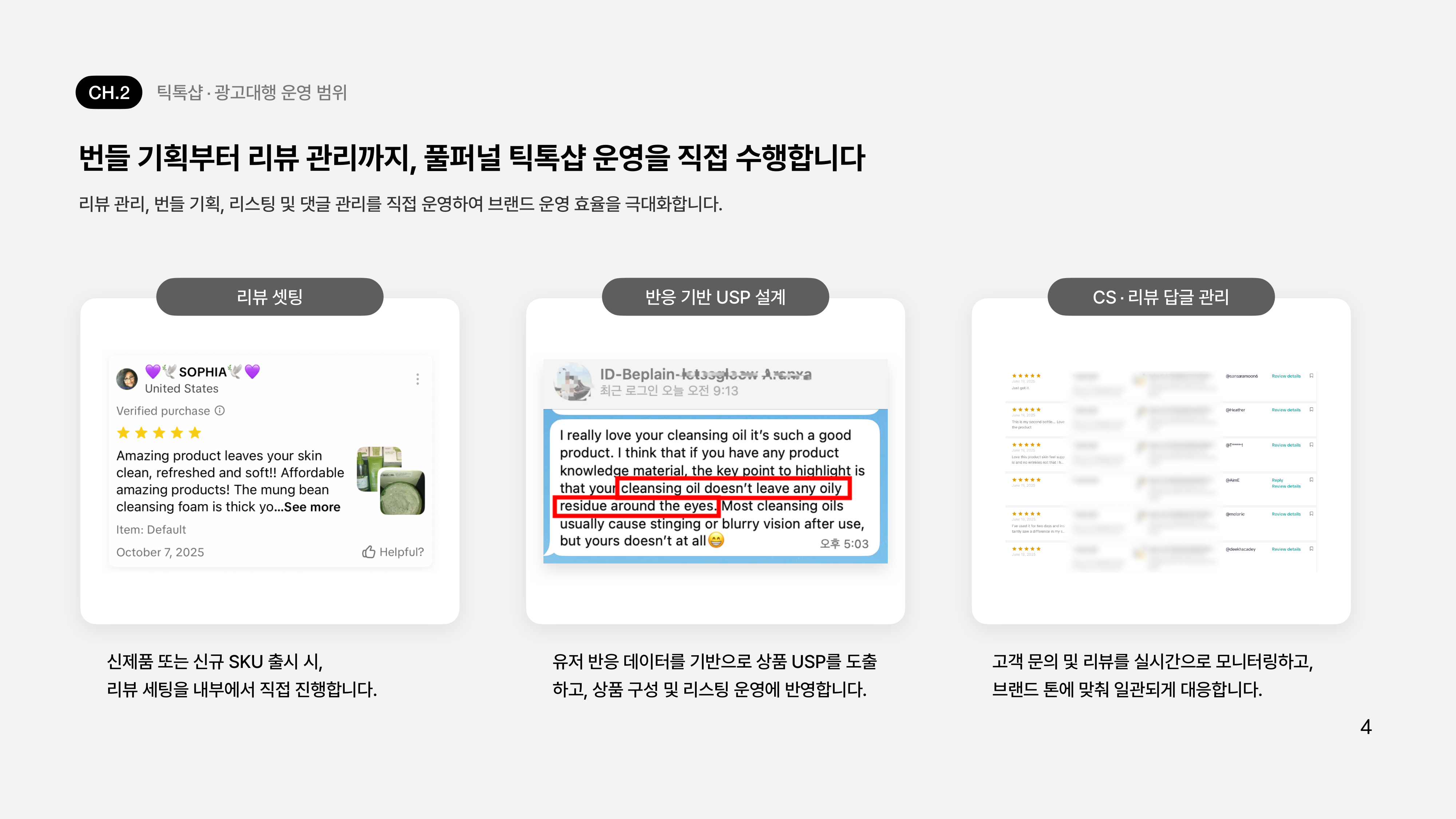 리뷰 관리, 번들 기획, 리스팅 및 댓글 관리를 직접 운영하여 브랜드 운영 효율을 극대화합니다. 리뷰 셋팅, 반응 기반 USP 설계, CS·리뷰 답글 관리.