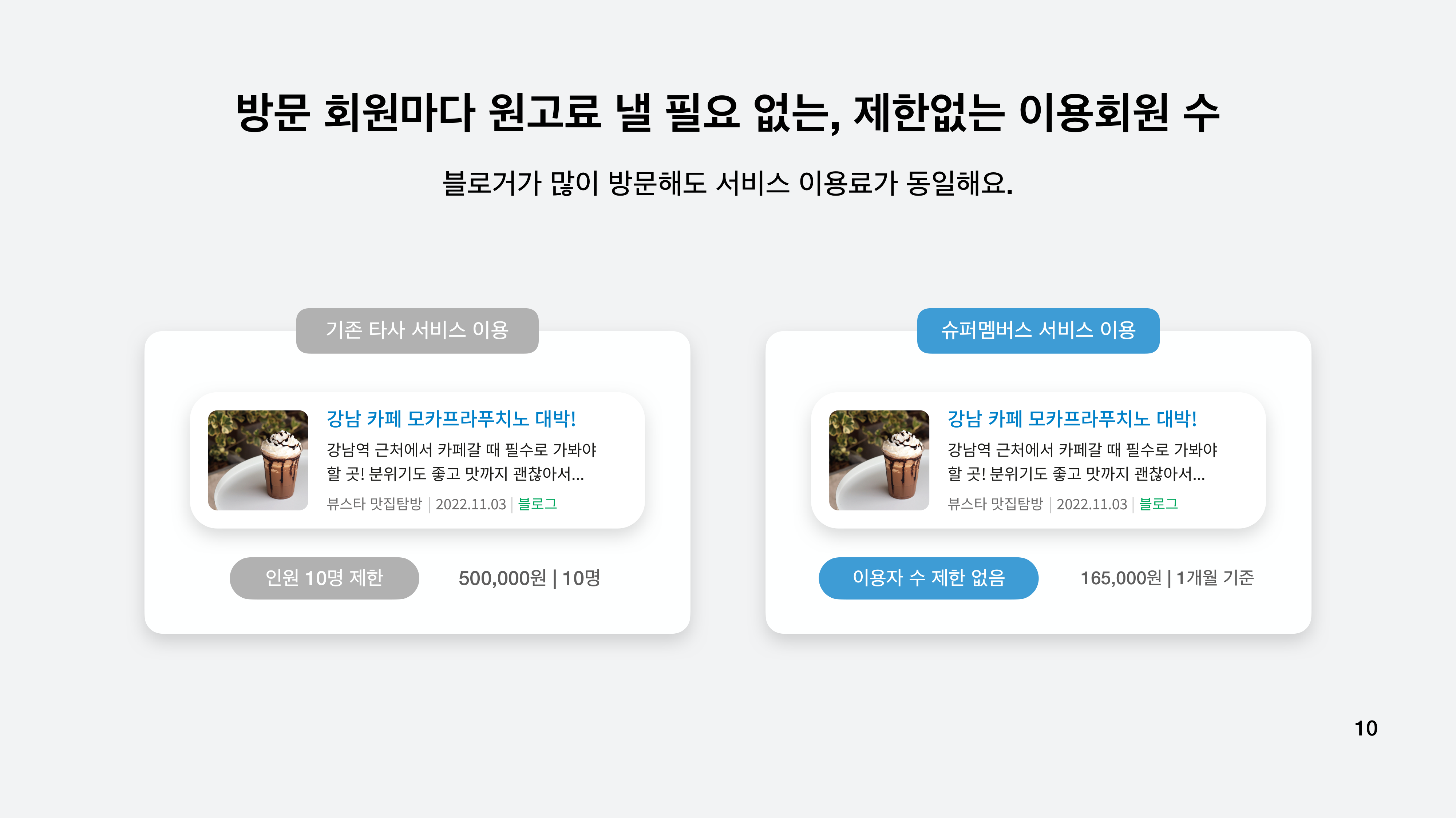 블로거가 많이 방문해도 서비스 이용료가 동일해요. 이용자 수 제한 없음, 월 165,000원부터. 약정 없이 월 단위 계약이 가능합니다.