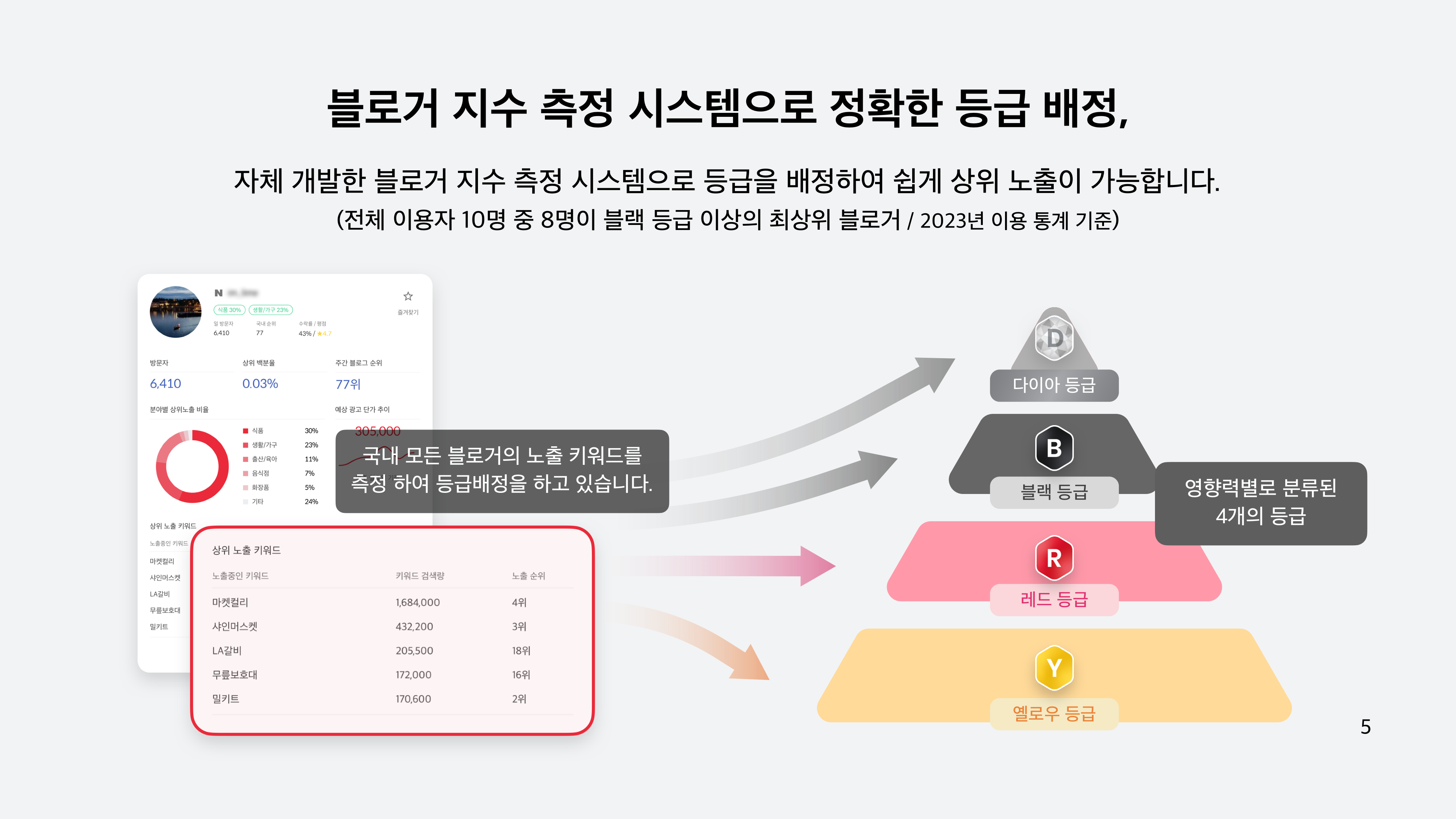 자체 개발한 블로거 지수 측정 시스템으로 등급을 배정. 전체 이용자 10명 중 8명이 블랙 등급 이상의 최상위 블로거입니다.