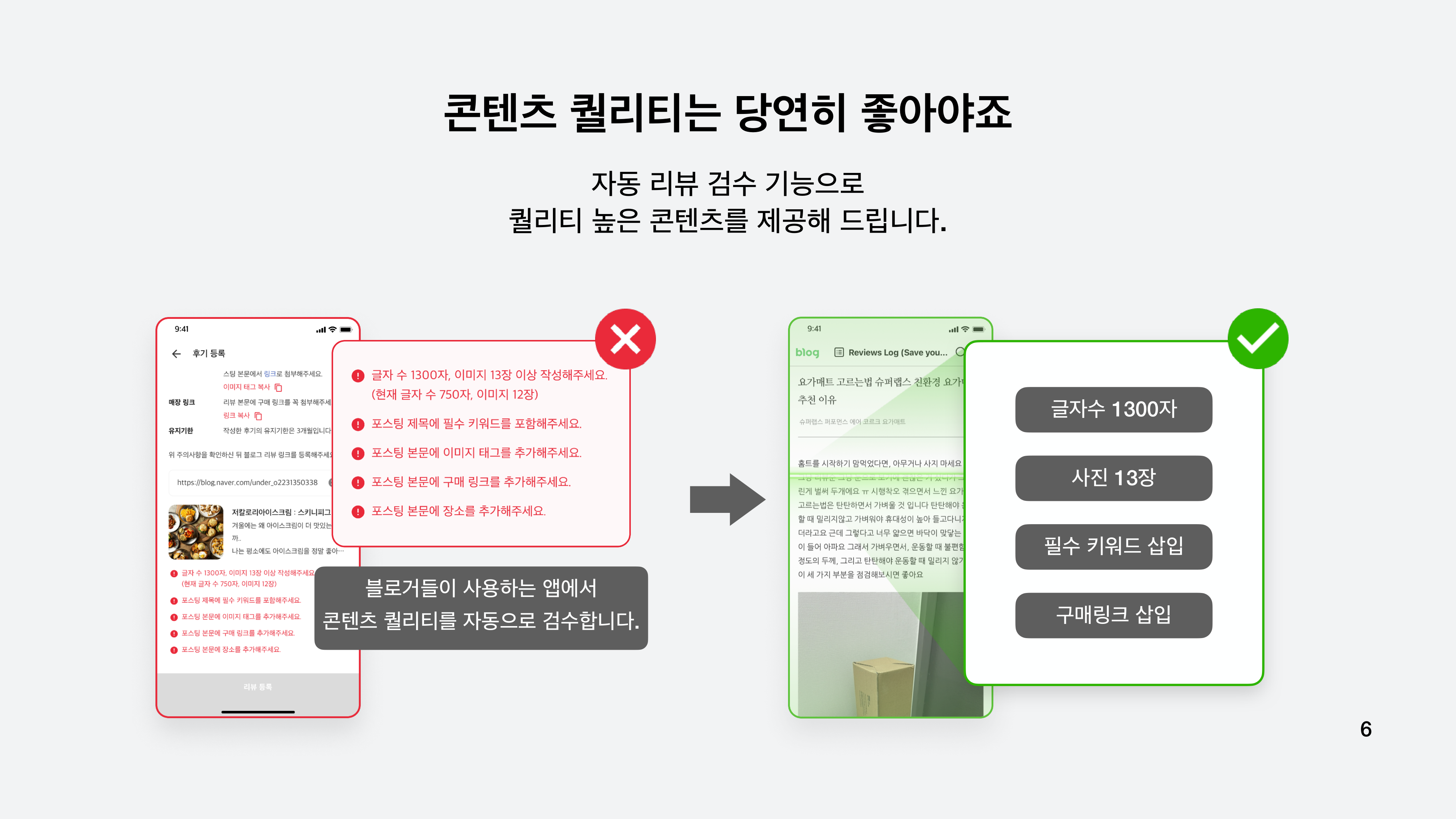 글자 수 1300자, 이미지 13장, 필수 키워드 삽입, 구매링크 삽입까지 — 블로거들이 사용하는 앱에서 콘텐츠 퀄리티를 자동으로 검수합니다.