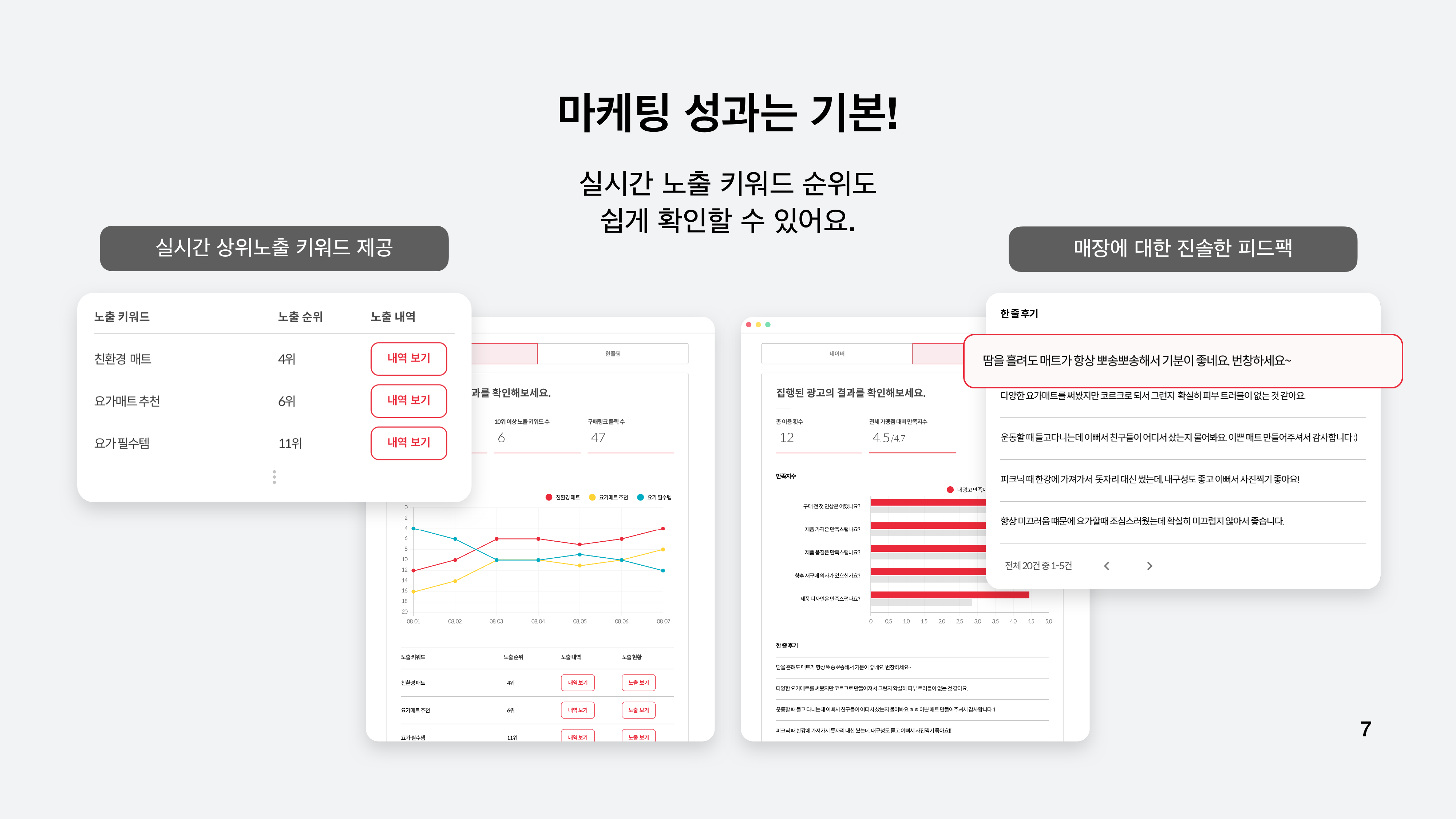 실시간 상위노출 키워드 제공, 마케팅 보고서, 매장에 대한 진솔한 피드백까지. 마케팅 성과를 한눈에 확인할 수 있습니다.