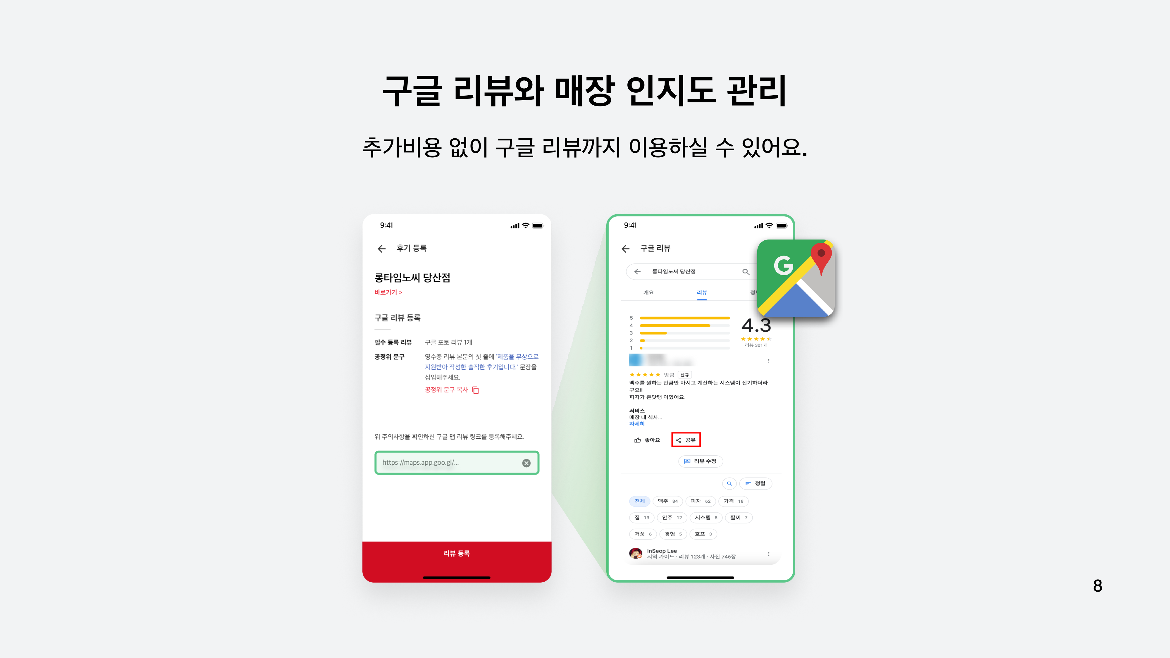 추가비용 없이 구글 리뷰까지 이용하실 수 있어요. 네이버 블로그 + 구글 리뷰를 동시에 관리합니다.